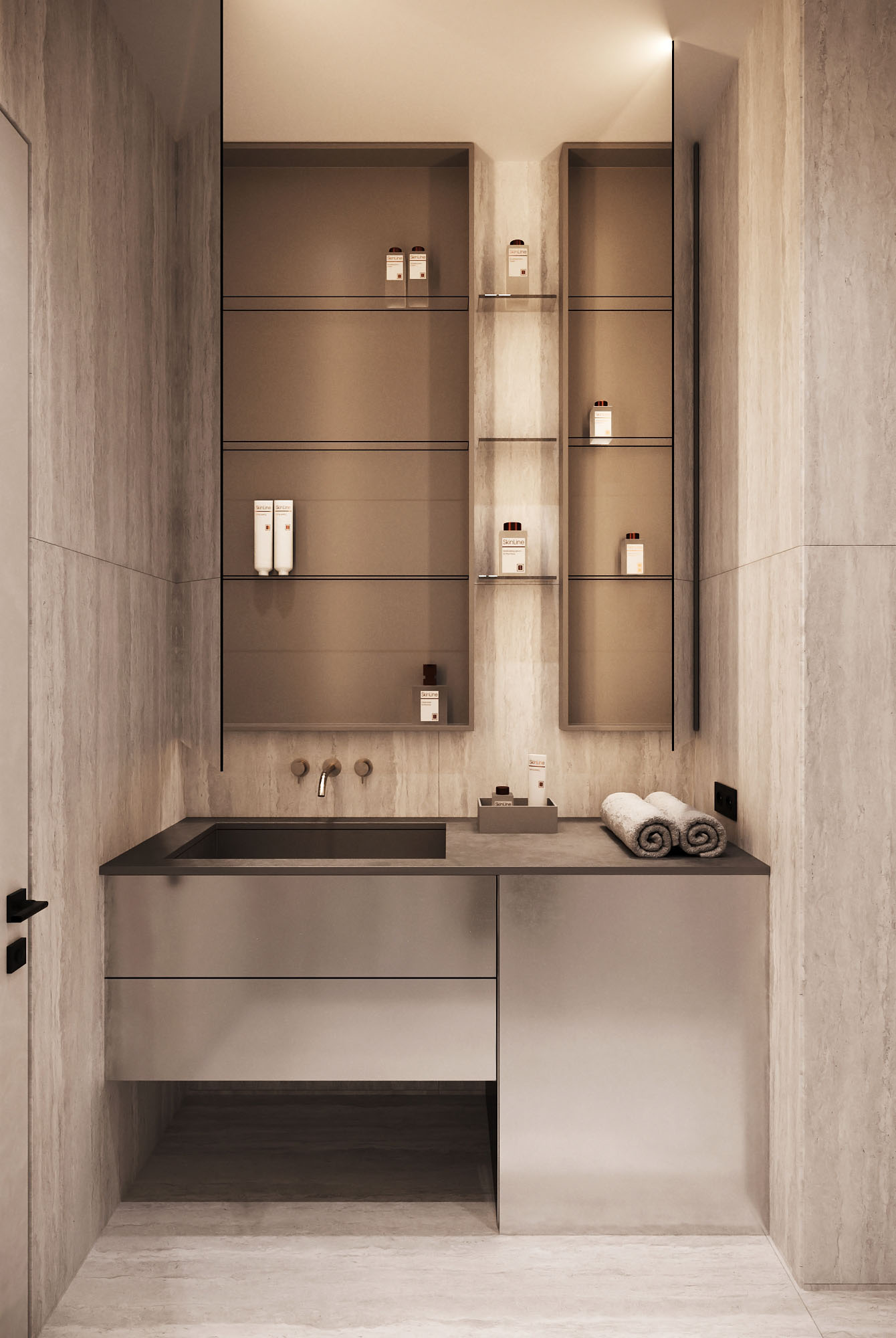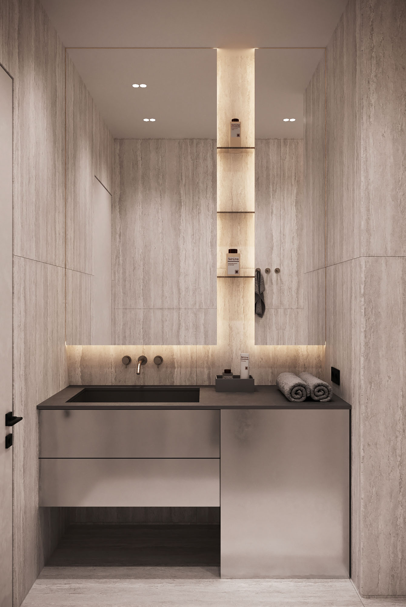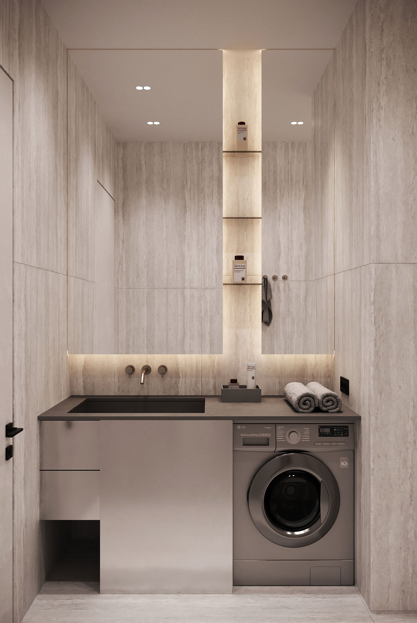 Все функции интегрированы в единый объём, что сохраняет визуальную чистоту пространства. Стиральная машина скрыта за фасадом и не считывается в интерьере, а основное хранение спрятано за зеркалом — это позволяет убрать всё лишнее из поля зрения. Подсвеченные ниши добавляют глубину и делают хранение частью композиции, формируя спокойную атмосферу с ощущением спа.