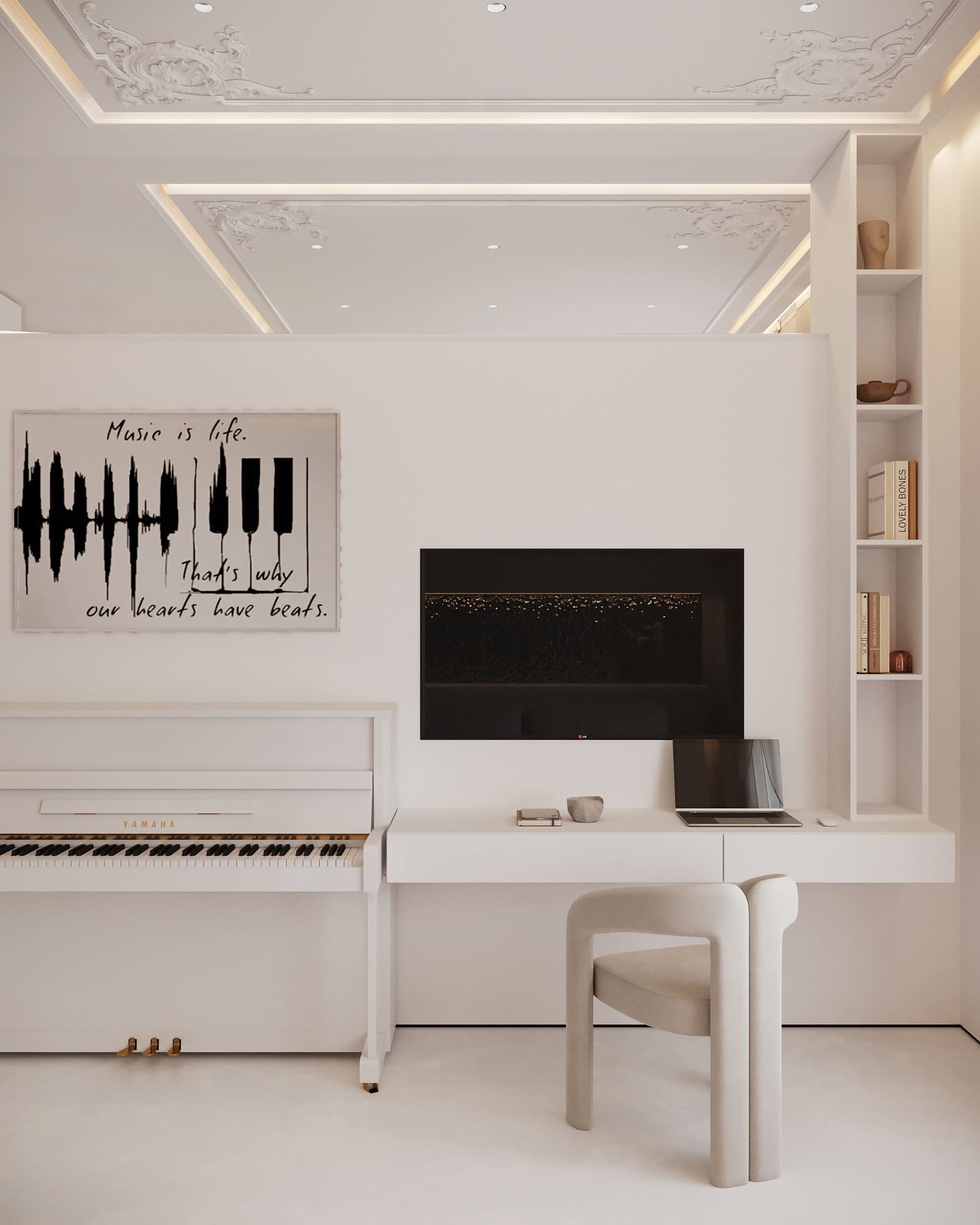 Пространство решено как единый архитектурный объём: кухня интегрирована в интерьер и сохраняет визуальную чистоту за счёт встроенных решений и лаконичных фасадов. Ключевой акцент — фактурный металлический фартук, добавляющий глубину и выразительность. Остров объединяет функции рабочей зоны, хранения и общения, оставаясь лёгким за счёт полупрозрачного исполнения. Гостиная компактна, но функциональна и дополнена акцентными предметами. Дополнительно интегрированы рабочая зона и место для пианино, расширяющие сценарии использования пространства.