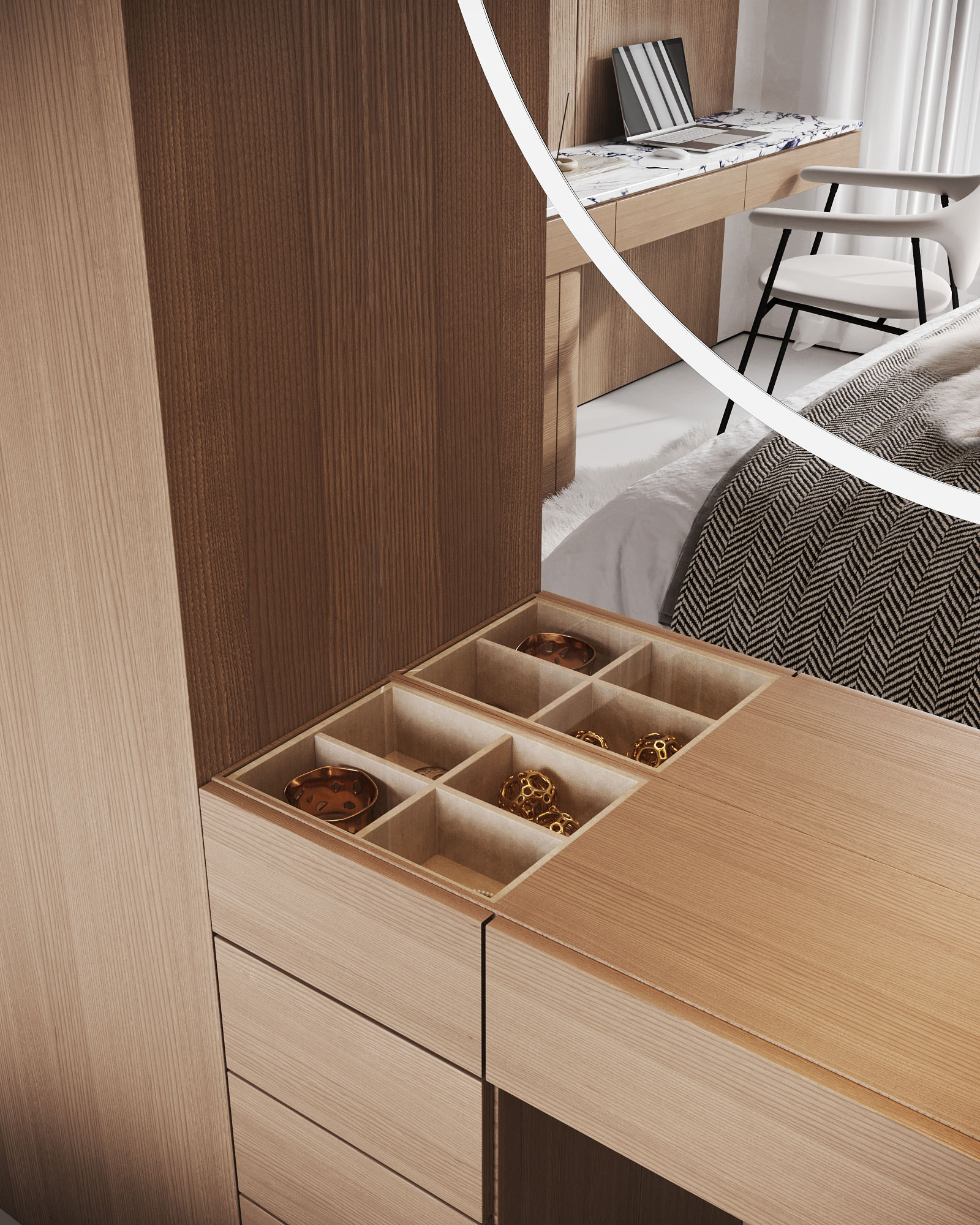 Пространство выстроено вокруг сценария хранения: для каждой категории вещей предусмотрено своё место, что формирует ощущение порядка и визуального спокойствия. Гардеробная интегрирована в архитектуру спальни и решена как отдельная зона, а не изолированное помещение — это сохраняет целостность пространства и упрощает повседневные сценарии.