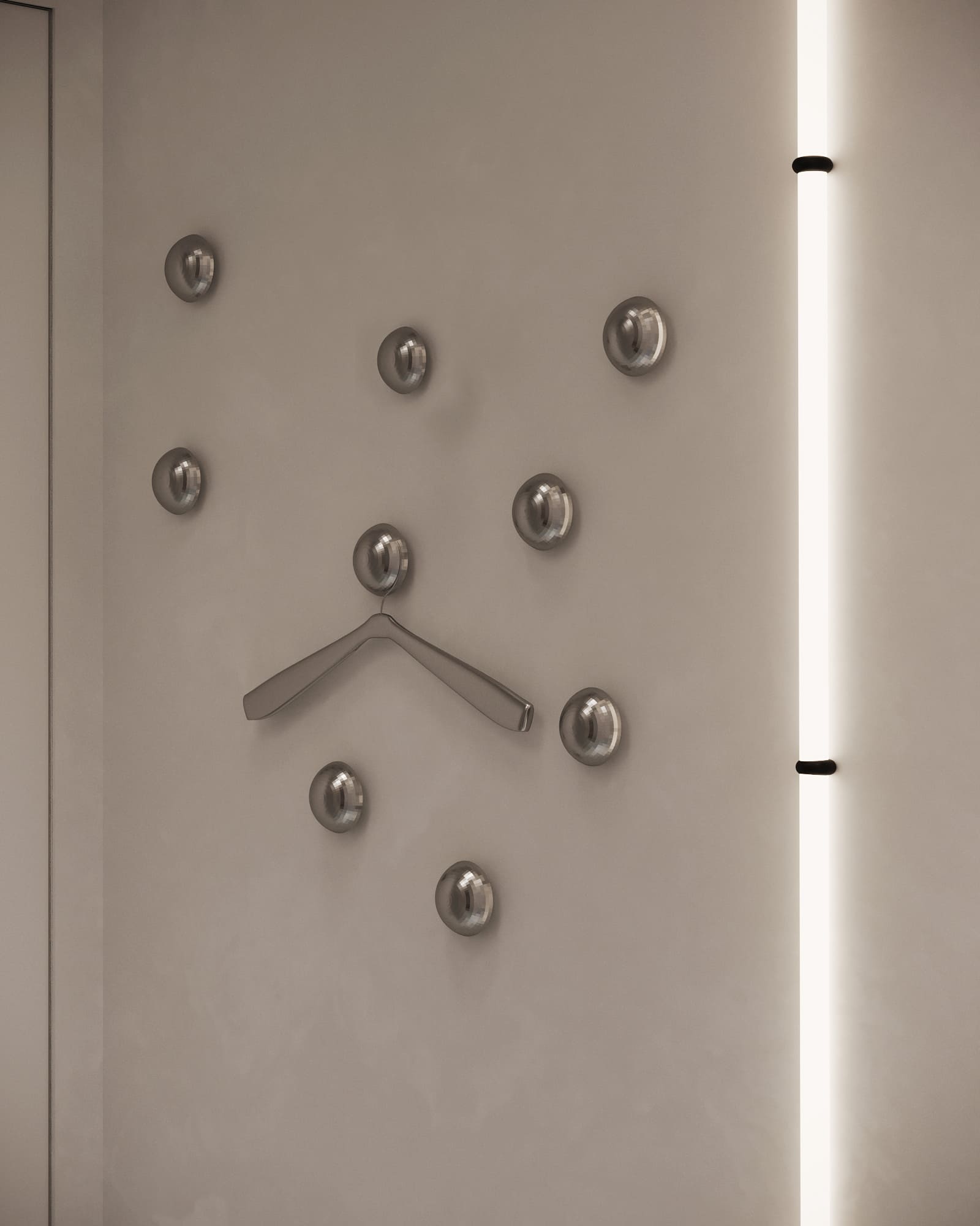 Пространство выстроено как функциональный буфер между улицей и жилой зоной: практичная входная часть, встроенные системы хранения и отдельный блок быстрого доступа закрывают все повседневные сценарии. Чистота интерьера сохраняется за счёт лаконичных фасадов, при этом акцентный цвет скрыт внутри шкафов — он раскрывается только в использовании, добавляя глубину и индивидуальность пространству.