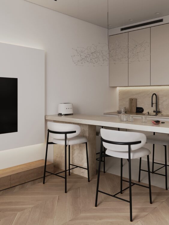 Кухня и гостиная объединены в единое светлое пространство, что визуально расширяет помещение и придаёт интерьеру ощущение свободы и лёгкости. Главная фишка — компактный, но функциональный стол-остров. Благодаря грамотному планированию, даже в небольшом помещении удалось разместить остров, который служит одновременно зоной готовки и обеденным столом, не перегружая интерьер.