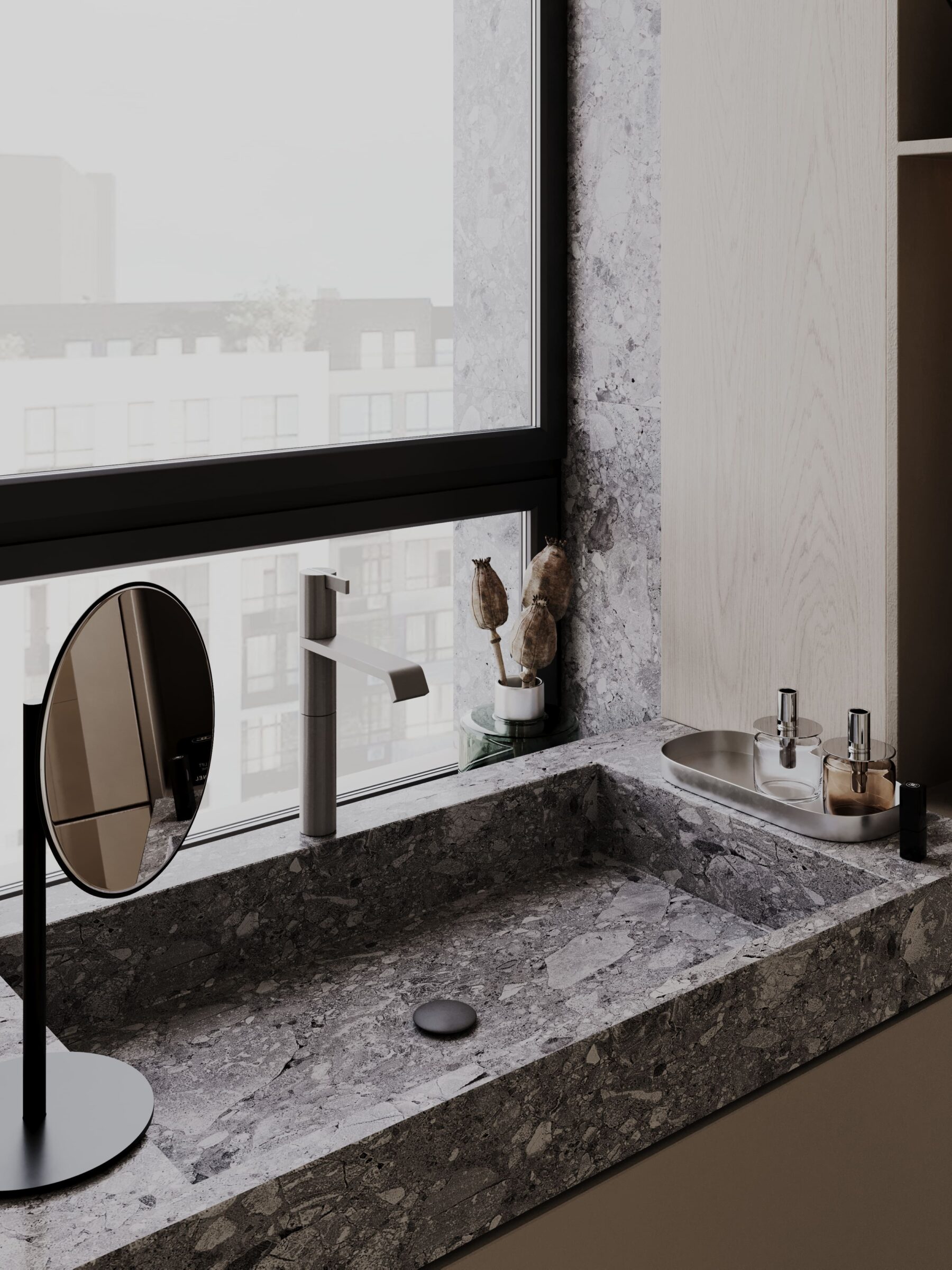Фишкой проекта стал умывальник, расположенный у окна — с возможностью наслаждаться красивым видом во время утренних ритуалов. Откосы оформлены тем же керамогранитом, что и сама раковина, создавая цельный и элегантный образ. Макияжное зеркало размещено сбоку на фасаде шкафа, за которым скрыто удобное хранение косметики — функционально, стильно и с заботой о ежедневном комфорте.