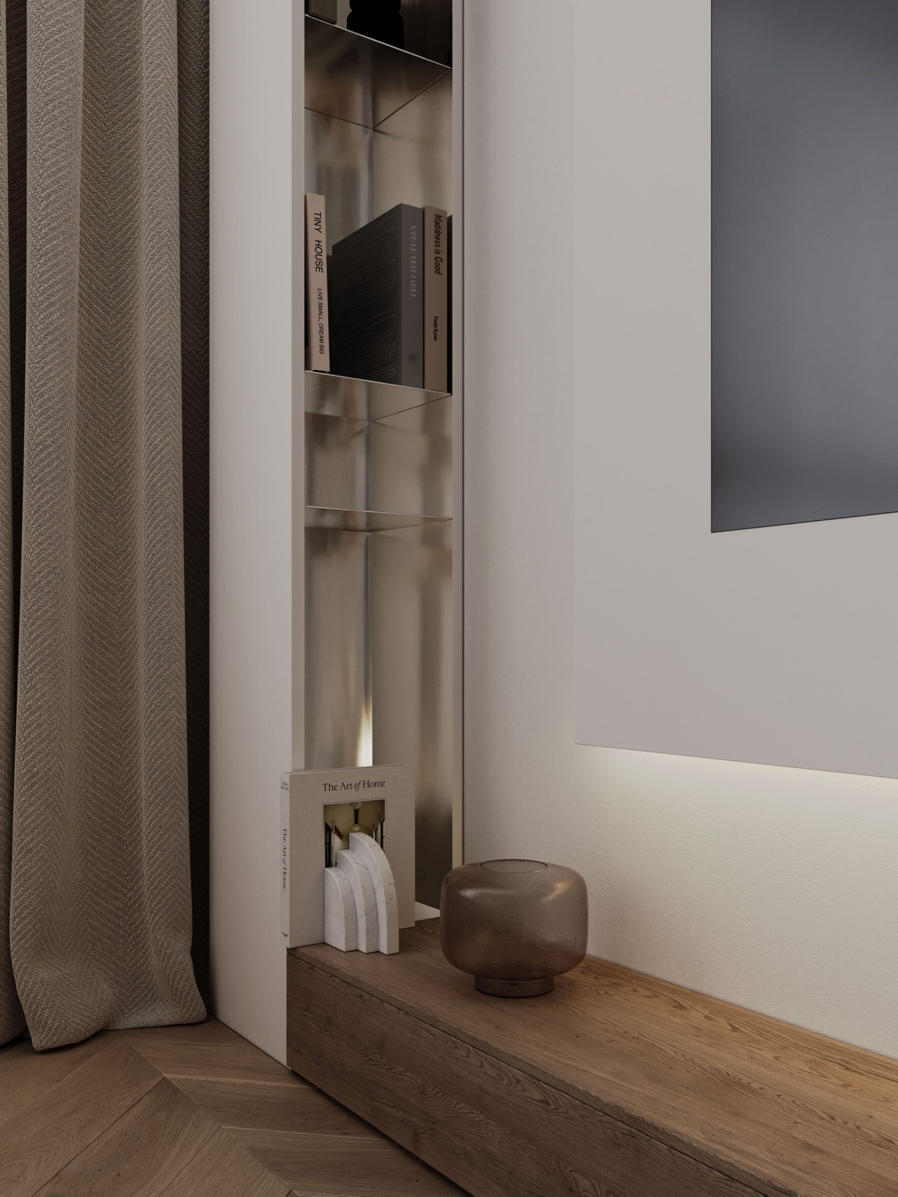 Весь интерьер выдержан в единой стилистике и цветовой гамме, что позволяет создать ощущение целостности и гармонии. Благодаря игре фактур, текстур и материалов, каждое помещение остаётся уникальным, но при этом органично вписывается в общий визуальный ритм квартиры.